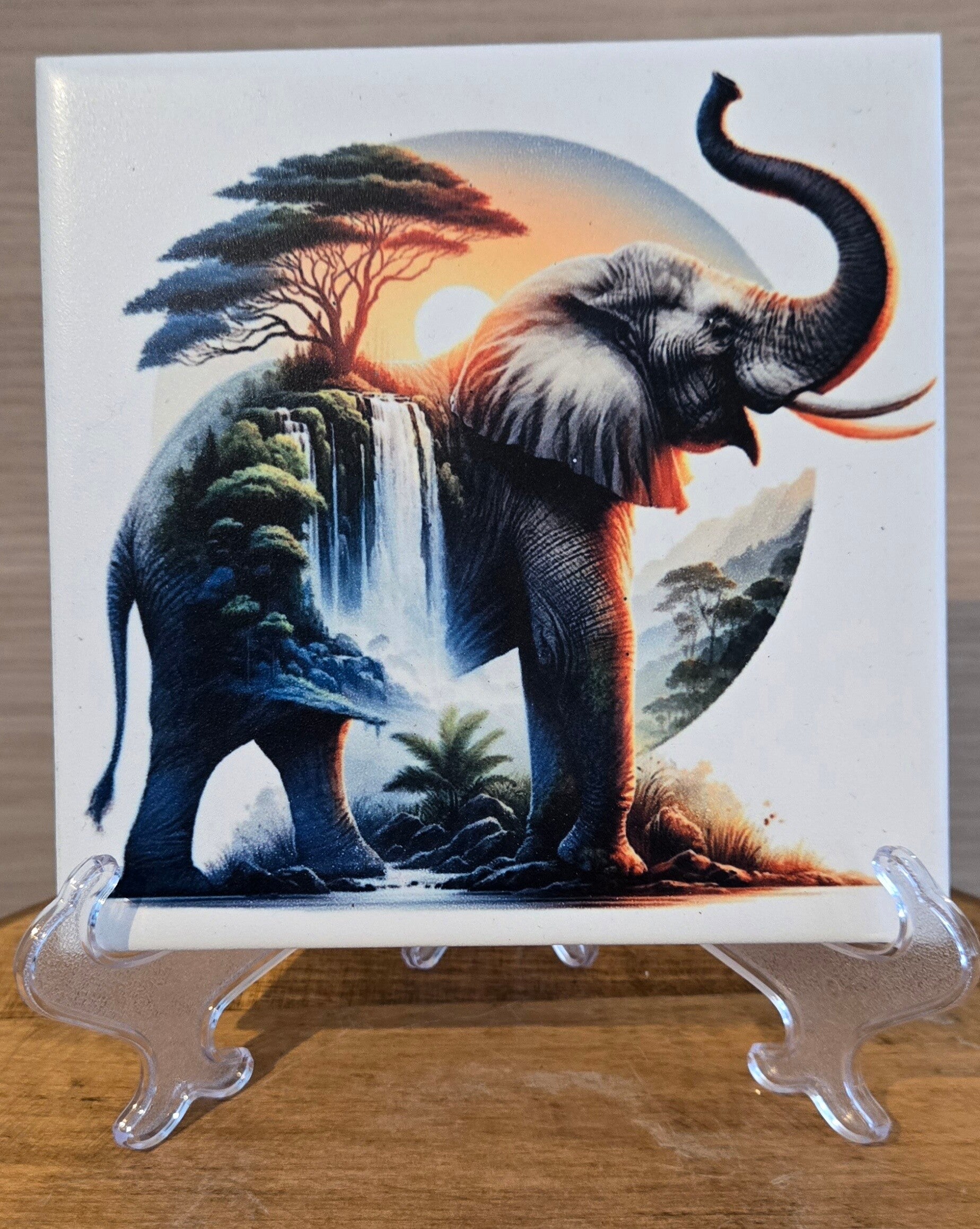 Reproduction d’une image sur un carreau de faïence posé sur un chevalet, avec une finition vernie qui protège et met en valeur les motifs.