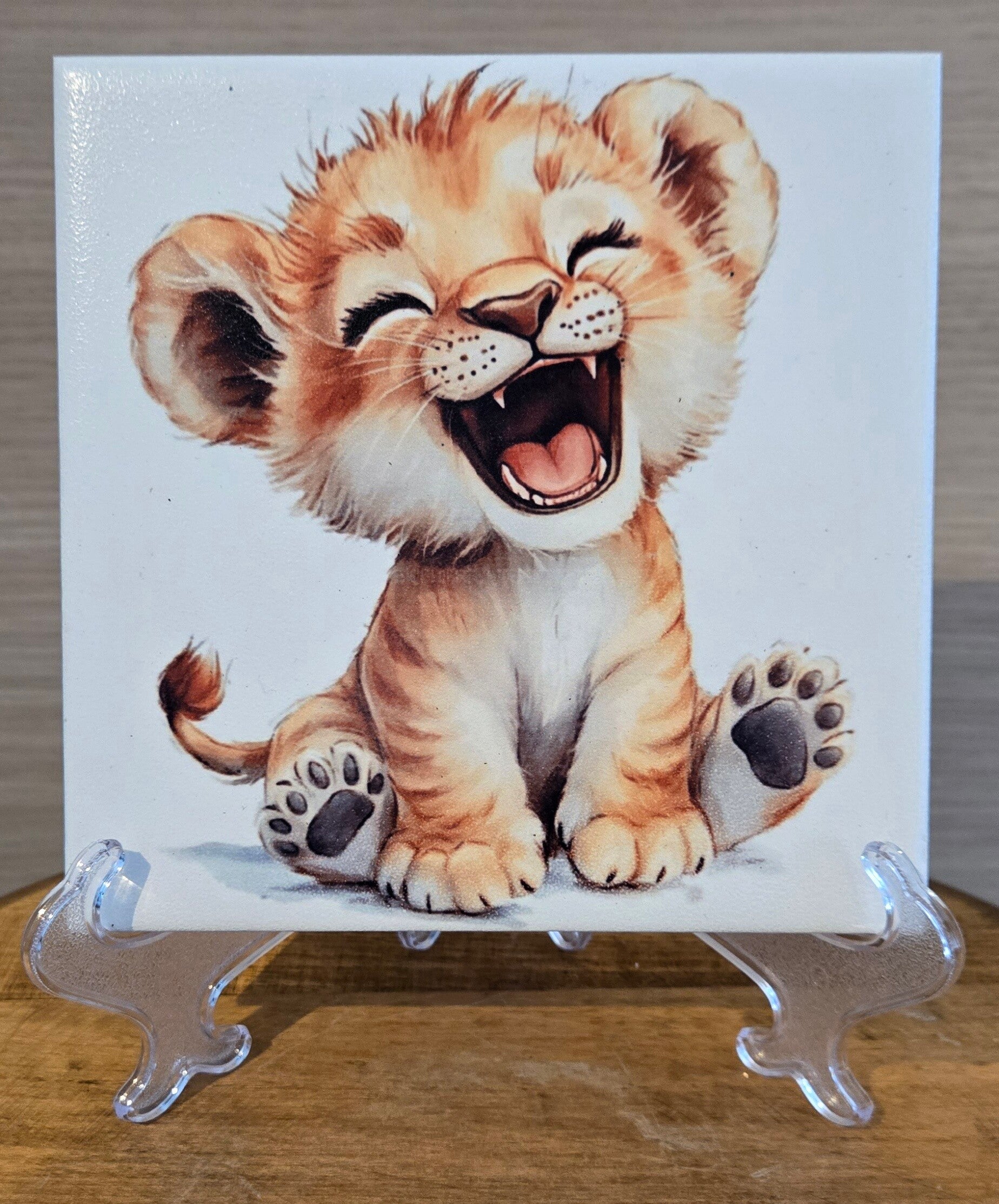 Reproduction d’une image sur un carreau de faïence posé sur un chevalet, avec une finition vernie qui protège et met en valeur les motifs.