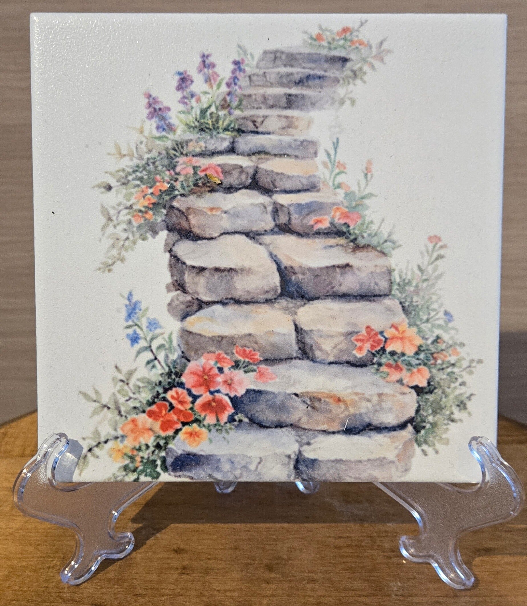 Cet article est vendu avec son chevalet et le carreau de faïence est disponible en deux dimensions au choix : 15x15 cm ou 20x20 cm.