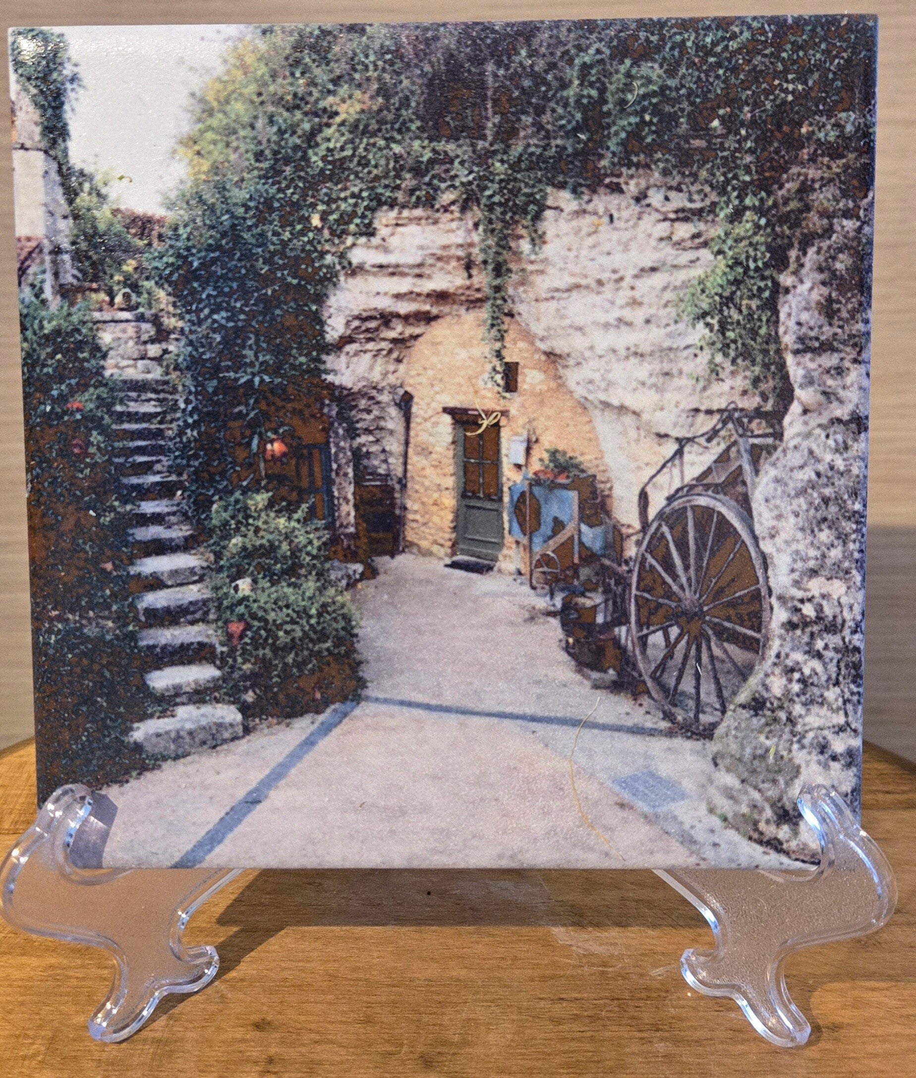 Reproduction d’une image sur un carreau de faïence posé sur un chevalet, avec une finition vernie qui protège et met en valeur les motifs.