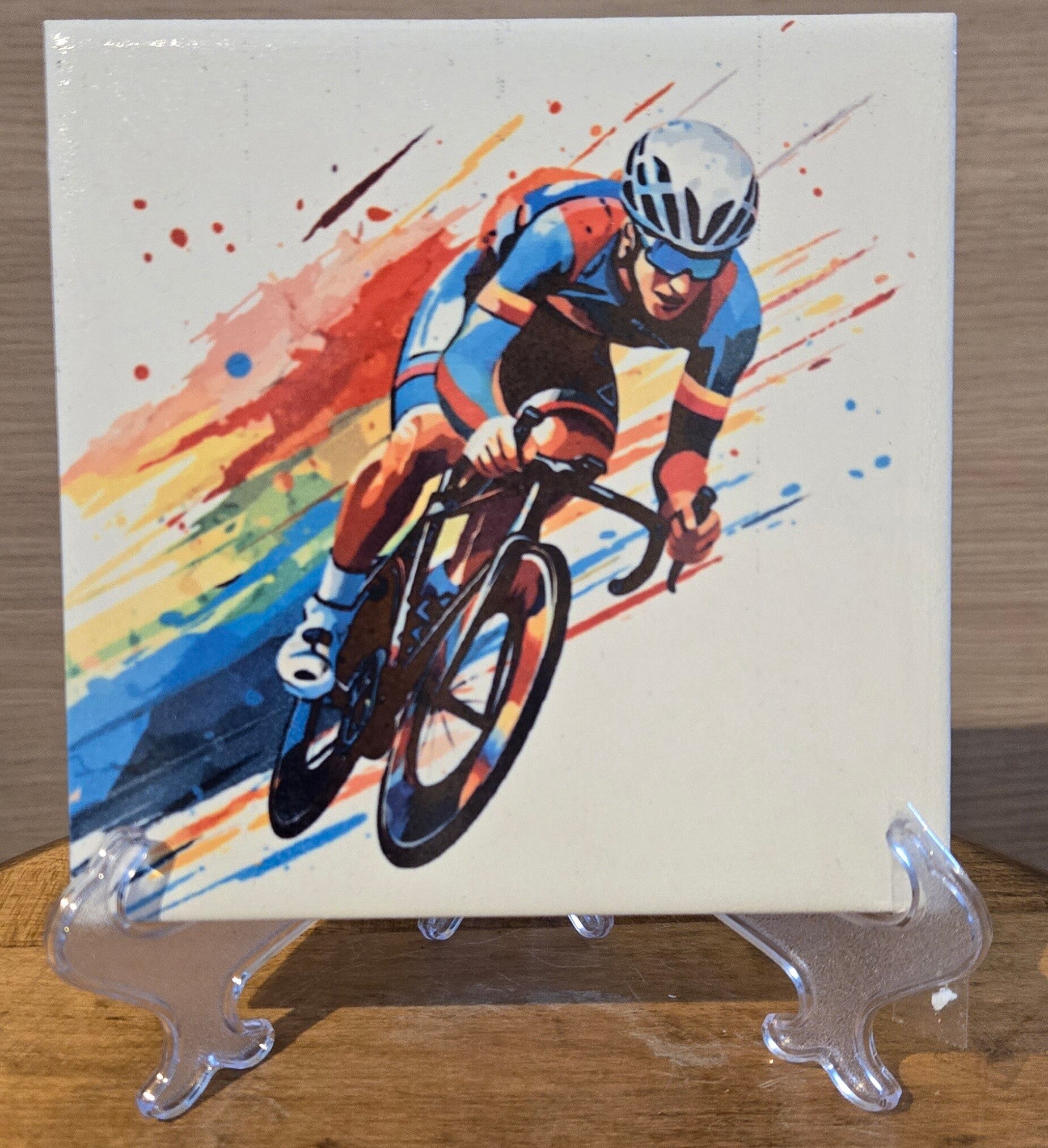 Reproduction d’une image sur un carreau de faïence posé sur un chevalet, avec une finition vernie qui protège et met en valeur les motifs.